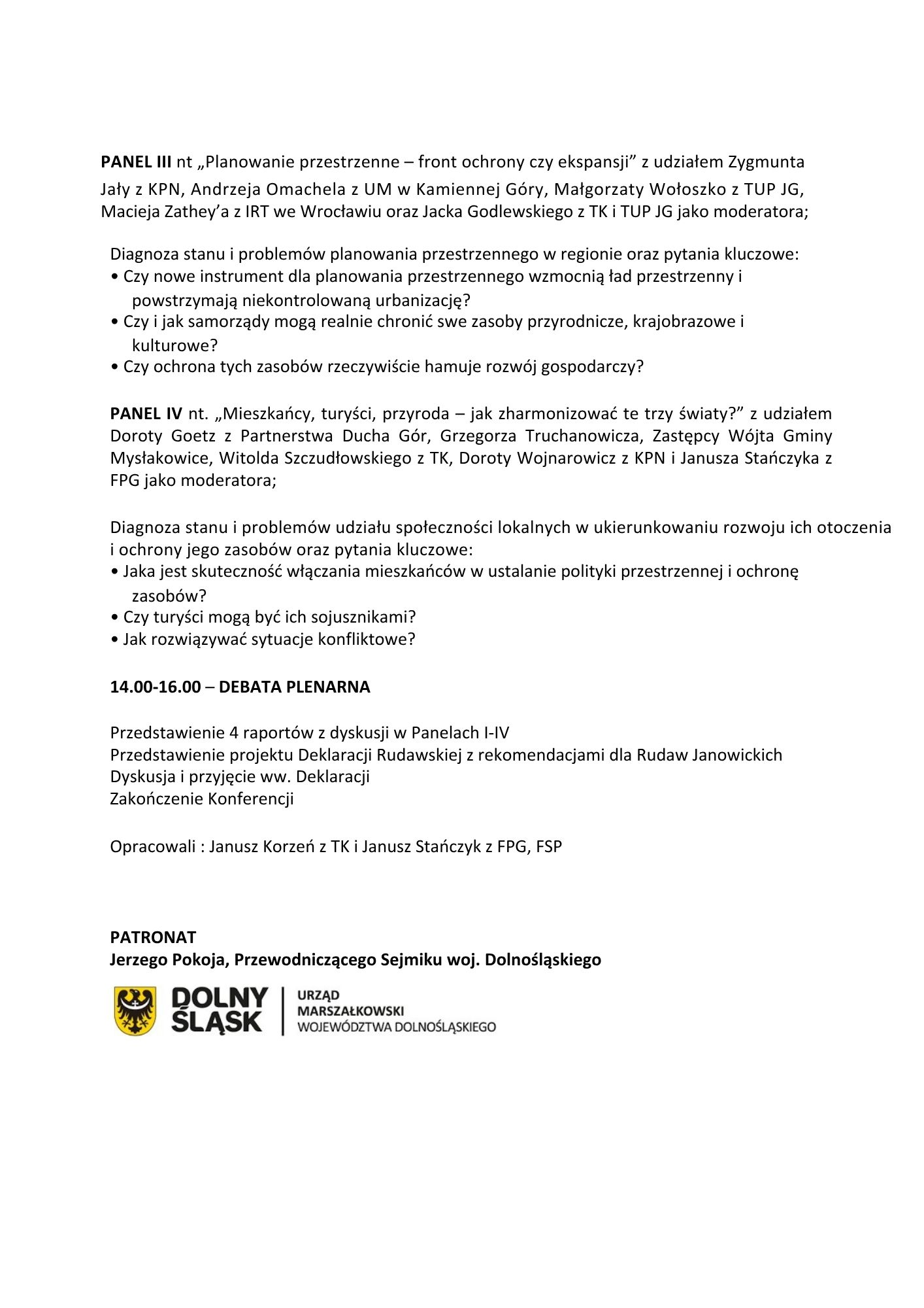 Konferencja będzie przestrzenią do wymiany perspektyw, konfrontacji różnych stanowisk oraz próby wypracowania wspólnych rekomendacji dla przyszłości Rudaw Janowickich. Zwieńczeniem spotkania będzie uroczyste podpisanie Deklaracji Rudawskiej